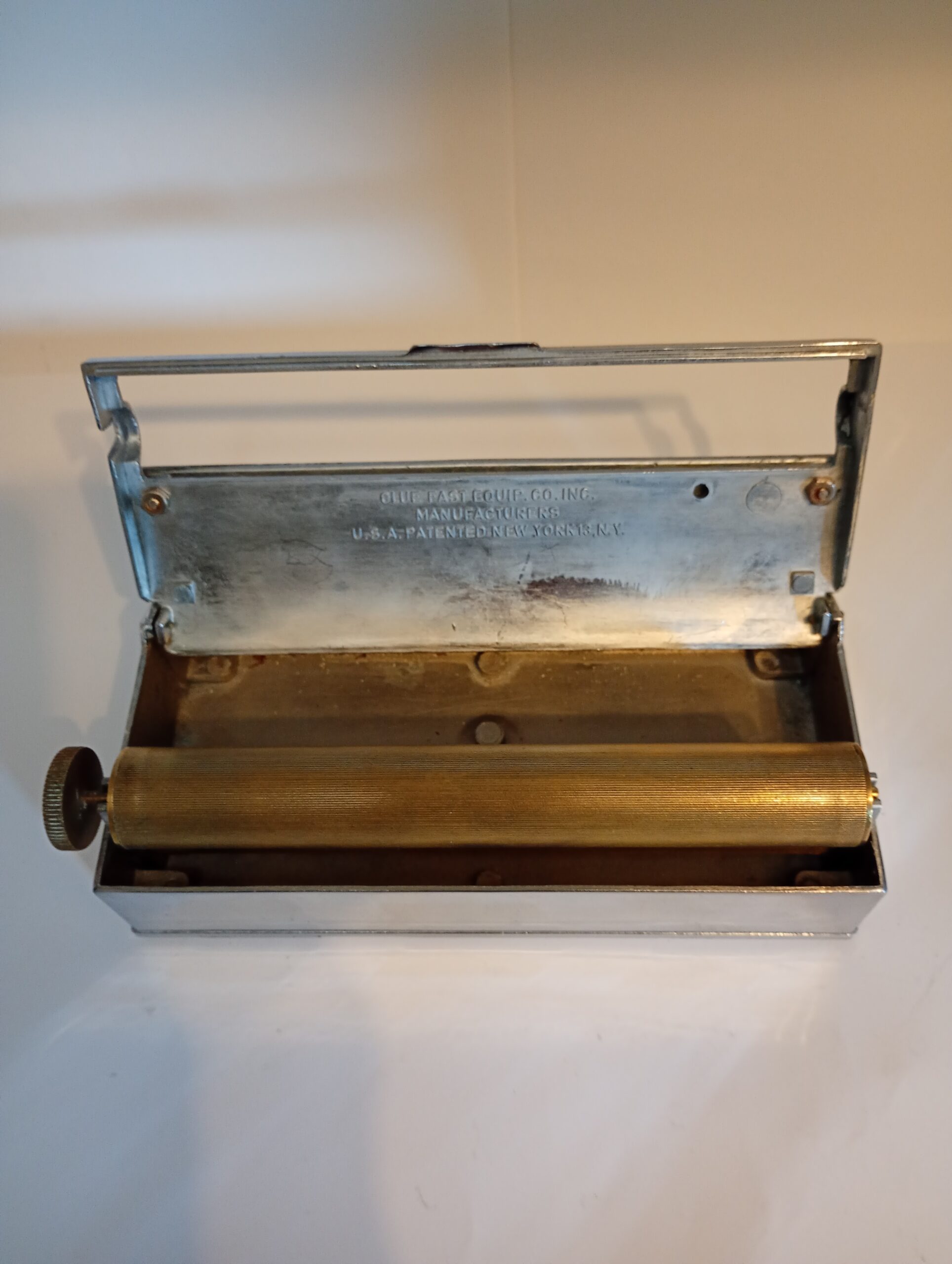 Tank holds water based paste glue and address labels were typed and rolled through to glue back a very collectable piece.