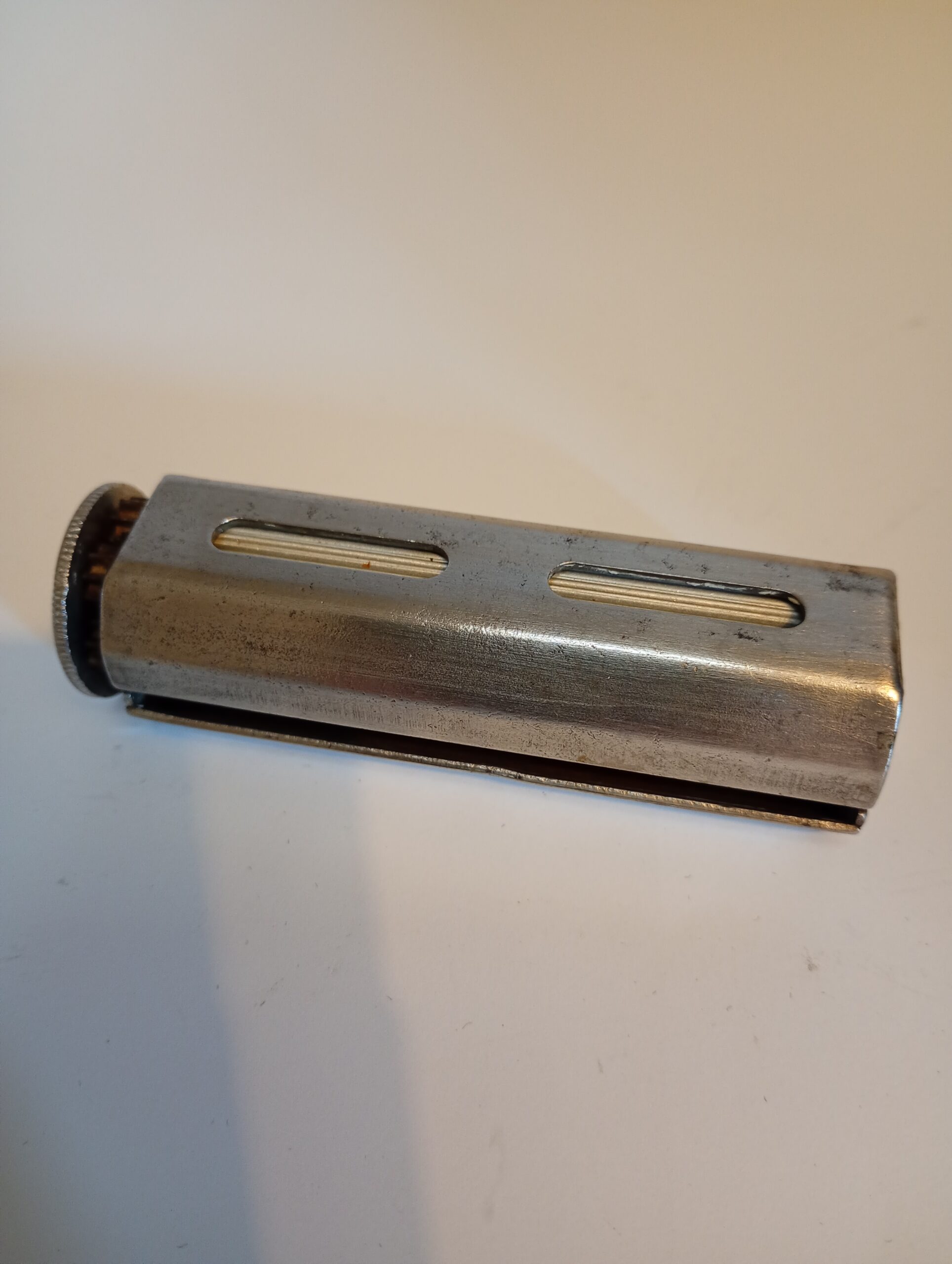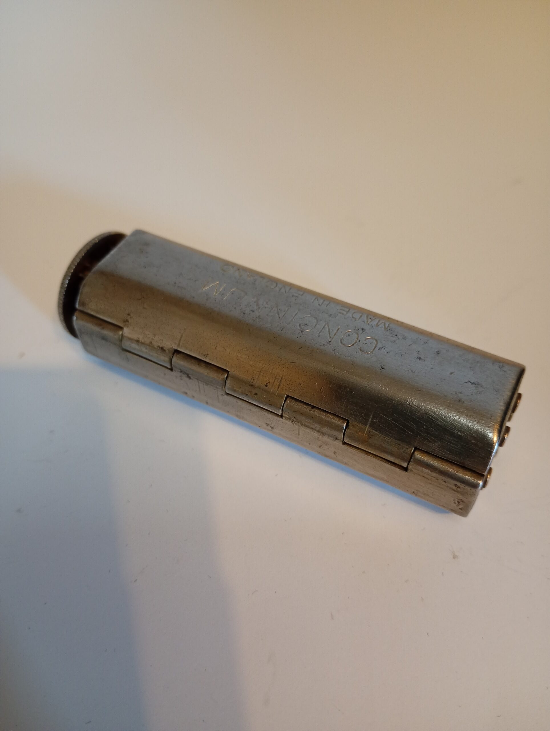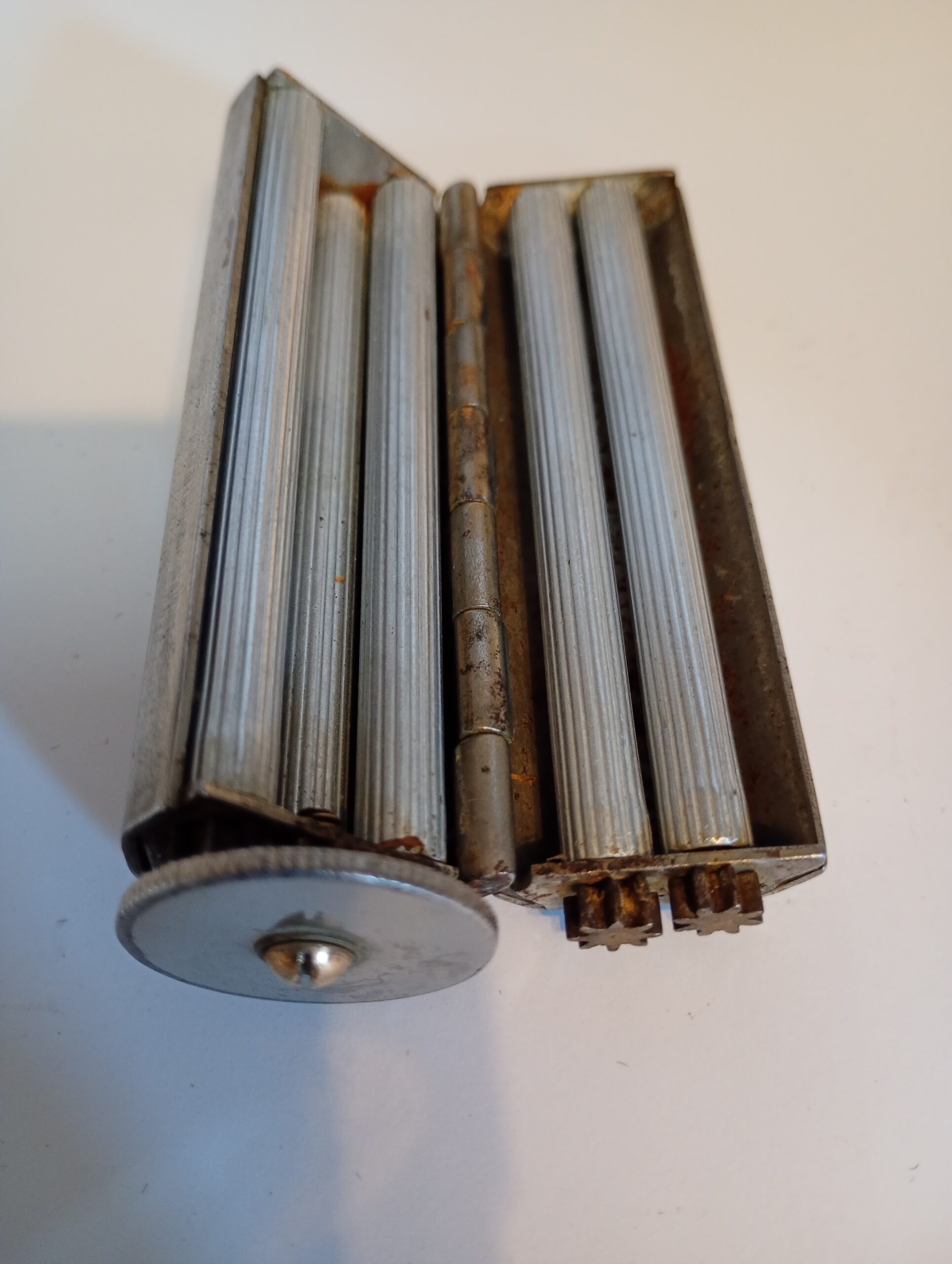 The Evans Patent Concinnum machine is a metal cigarette roller which opens to allow the user to lay cigarette paper inside, place in the required amount of tobacco then close and operate the rollers to create the ‘roll your own’ cigarette. Tidy condition for age and working