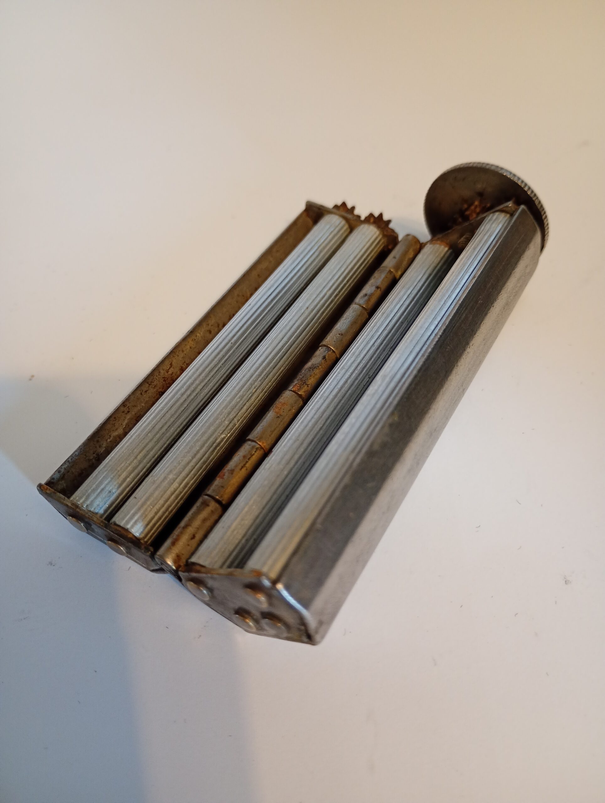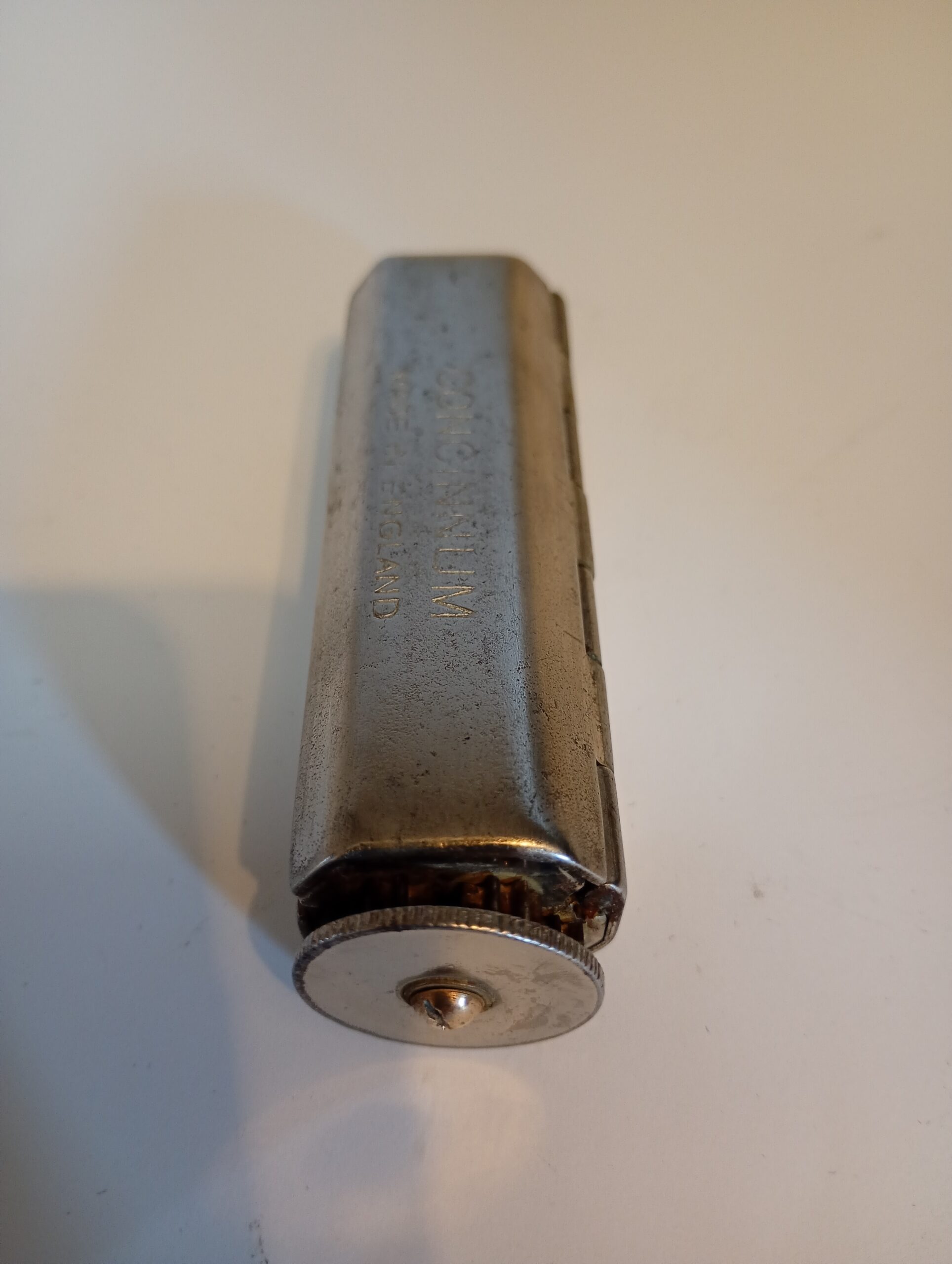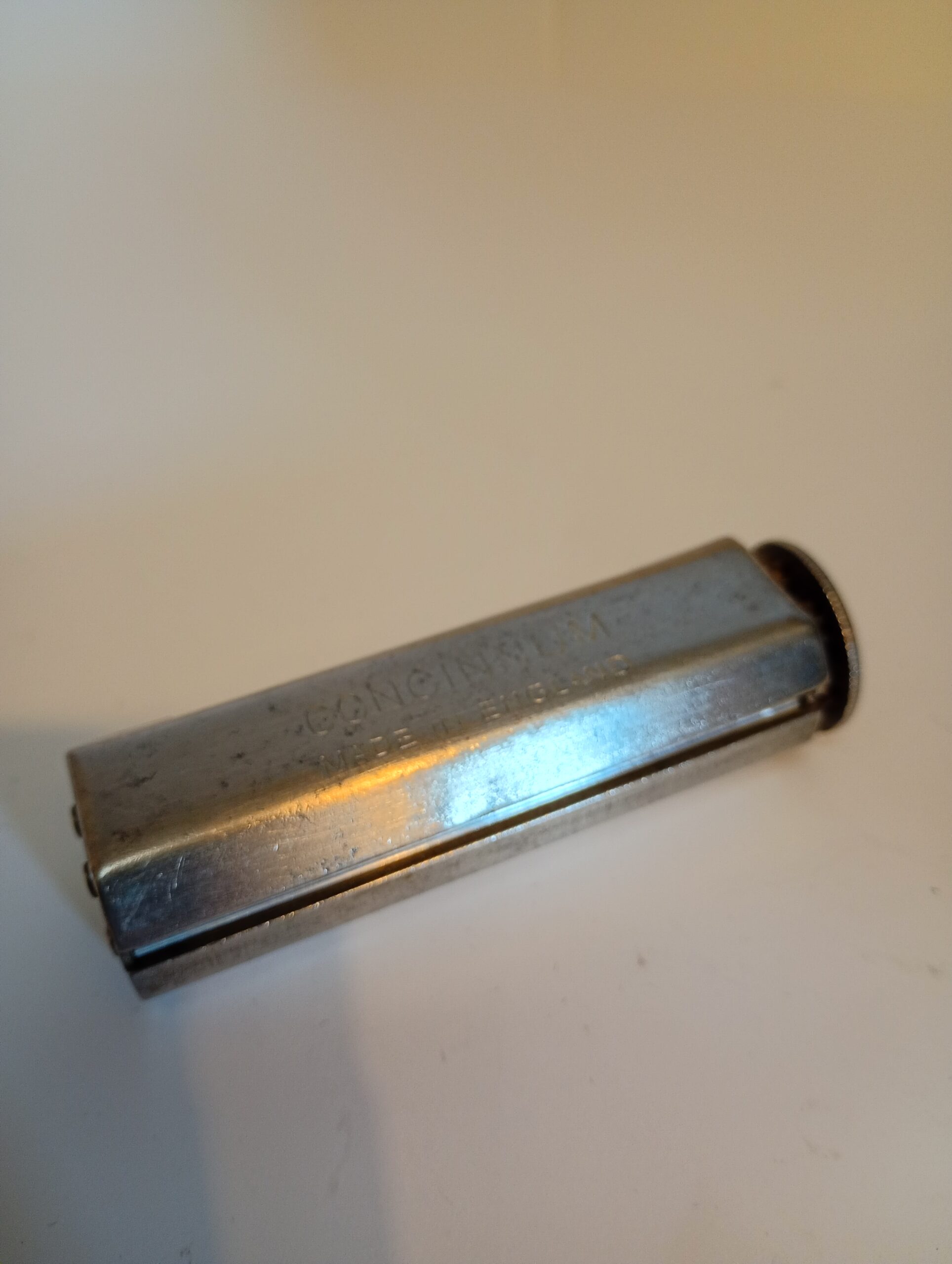 The Evans Patent Concinnum machine is a metal cigarette roller which opens to allow the user to lay cigarette paper inside, place in the required amount of tobacco then close and operate the rollers to create the ‘roll your own’ cigarette. Tidy condition for age and working